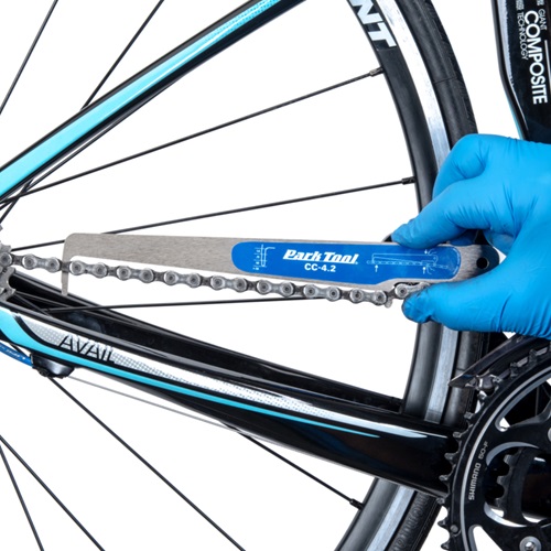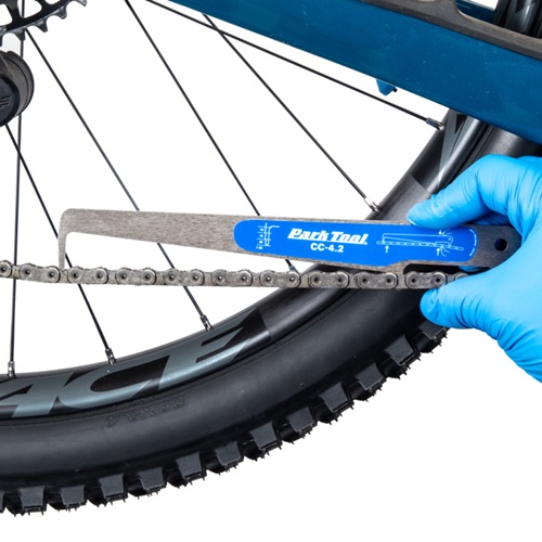 A worn bicycle chain causes poor shifting performance and can actually wear out drivetrain components, causing more expensive problems. The Park Tool CC-4.2 Chain Checker is a drop-in style gauge that measures bicycle chain wear. The laser-cut CC-4.2 accurately measures a long section of chain and strategically comes in contact with the chain in three places, quickly and easily taking the guesswork out of determining when chain replacement is necessary. The tool works on any 5 to 13-speed derailleur chain (including SRAM® T-Type, SRAM® Flattop™, Shimano® XTR® 12-speed, and Campagnolo® Ekar™ 13-speed chains) or single-speed chain, and is designed to accurately indicate when a chain reaches 0.5%, 0.75%, and 1.0% wear, the points at which most chain manufacturers suggest replacement.