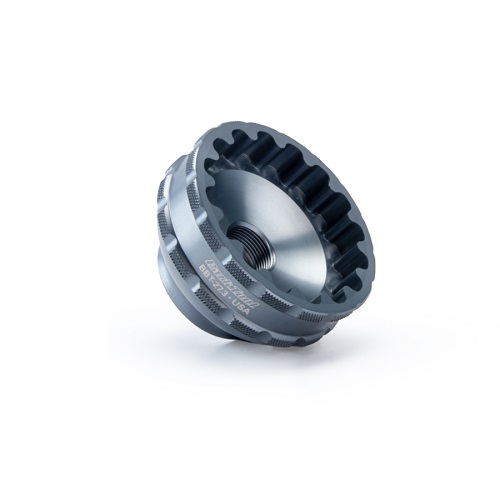 A precision CNC-machined aluminum tool for the installation and removal of select threaded bottom brackets with 16-notch tool fittings, including FSA® MegaEvo®, Wheels Manufacturing™ T47, & Wheels Manufacturing™ PF30. Manufactured in-house by Park Tool, anodized for easy identification and featuring a ratchet/torque wrench-compatible 3/8" drive.
