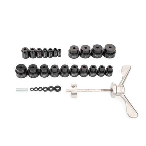 The SBK-1 is a professional-level kit for installing and removing cartridge bearings in bicycle suspension pivots. A comprehensive set of 27 precision-machined hard-anodized guides enables compatibility with a wide range of bearing inner and outer diameters. Combined with our proven bearing press design, the SBK-1 quickly and easily pushes the old bearing out of the linkage, and reinstalls the new bearing precisely and squarely. Organized in a convenient storage case.