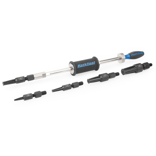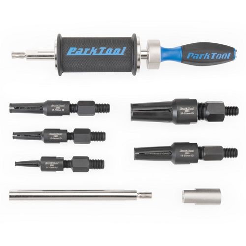 Utilizing expanding collets and a slide hammer with a long shaft, the SHX-1 securely yet forcefully drives out press fit cartridge bearings with targeted impact. Compatible with most press fit bearing applications found on bicycles including hubs, suspension linkages, and bottom brackets. Organized in a convenient storage case.