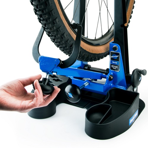 With extra-tall uprights and wide calipers, the TS-2.3 is capable of accepting most wheels commonly found on road, mountain, BMX, and hybrid bicycles, including wheels with disc brakes, aero rims and oversized MTB tires. Upright adjustment is controlled with an ergonomically-designed speed knob, which quickly adjusts the stand to accommodate any hub width in seconds. The sturdy uprights of the TS-2.3 feature integrated storage for the included thru-axle adapters, which allow for compatibility with thru-axle, quick release, and solid axle hubs without the use of additional parts or adapters.